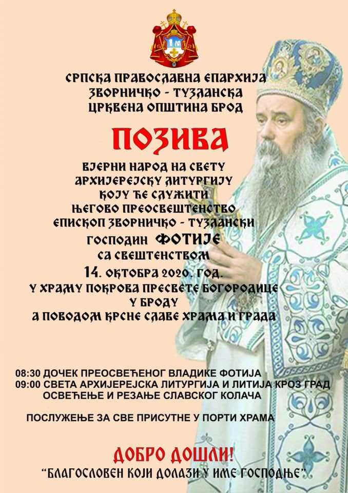 На сам празник, Покров Пресвете Богородице, служиће се Света архијерејска литургија коју ће служити Преосвећени владика Фотије у 09.часова. Предвиђен је дочек нашег епископа у 08.30. часова.