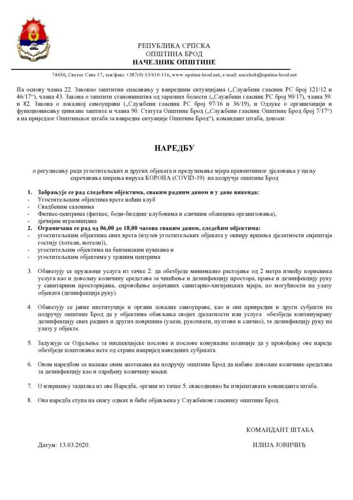 На сједници штаба за ванредне ситуације на тему епидемије корона вируса, на којој су, поред руководства општине присуствовали представници Дома здравља, директори јавних установа и предузећа, те представници Одсјека за послове заштите и спасавања општине Брод, разматрана је тренутна епидемиолошка ситуација, мјере које су донијеле општине у окружењу, а на основу расположивих информација донeсена је и сљедећа наредба.