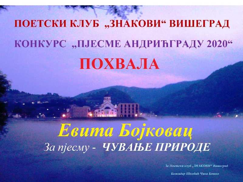 На шестом конкурсу „Пјесме Андрићграду 2020“, а на тему „Природа-животна тема“ у организацији вишеградског Поетског клуба „Знакови“, уз покровитељство општине Вишеград, предузећа „ХЕ на Дрини“ и Андрићграда, а на који је пристигло велики број пјесама од аутора из земље и региона.