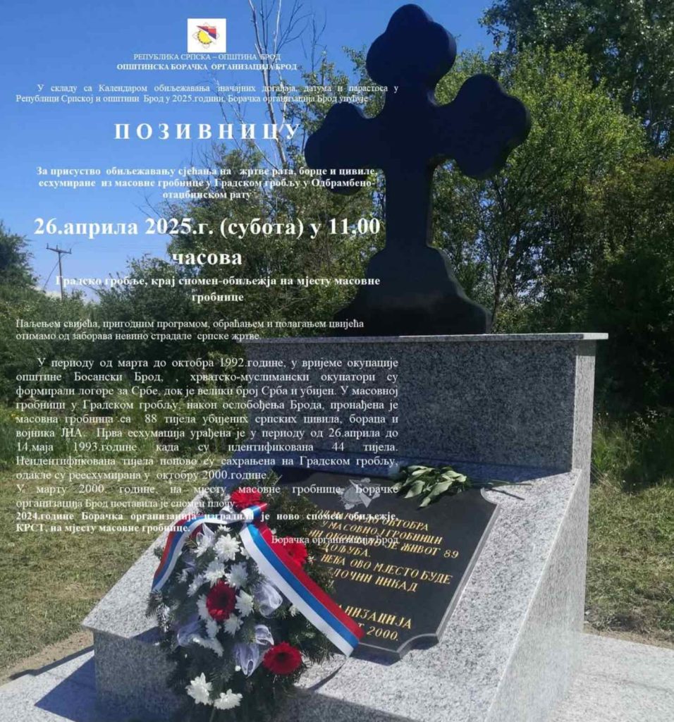 Паљењем свијећа, пригодним програмом и полагањем цвијећа крај спомен-обиљежја на мјесту масовне гробнице на Градском гробљу у Броду ће у суботу, 26. априла 2025. године од 11:00 часова бити обиљежено сјећање на жртве рата, борце, војнике и цивиле Одбрамбено-отаџбинског рата чија су тијела ексхумирана из масовне гробнице.