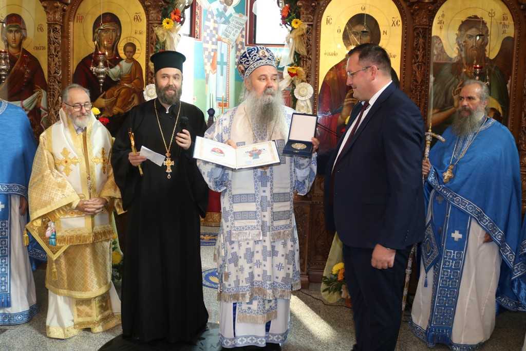 Видић је епископу Фотију уручио признање ове локалне заједнице – Повељу Покров Пресвете Богородице, која се додјељује поводом Дана општине Брод – 7. октобра.