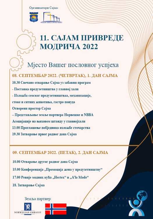 PODIJELI Facebook Twitter LinkedIn Pinterest Email Telegram WhatsApp Copy Link Општина Модрича и Развојна агенција општине Модрича организују 11. Сајам привреде “Модрича 2022”, који ће свечано бити отворен 8. септембра у 10,30 часова. ПН