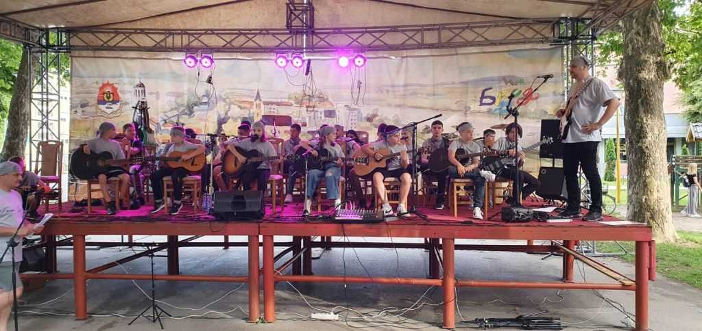 Чланови бродског удружења „Љубитељи школе гитаре“ вечерас су у Градском парку у Броду одржали концерт – Четврту малу гитаријаду.