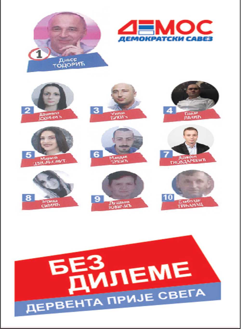 PODIJELI Facebook Twitter LinkedIn Pinterest Email Telegram WhatsApp Copy Link Demokratski savez /DEMOS/ Derventa predstavlja listu kandidata za odbornike u Skupštini opštine Derventa.