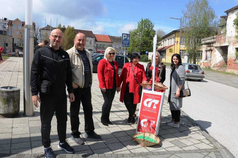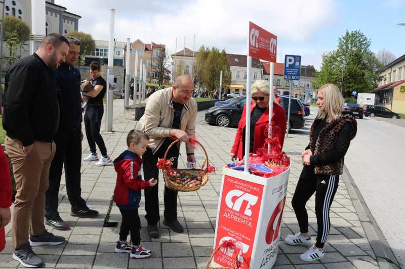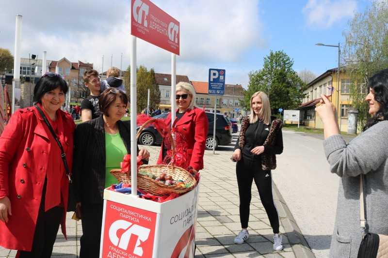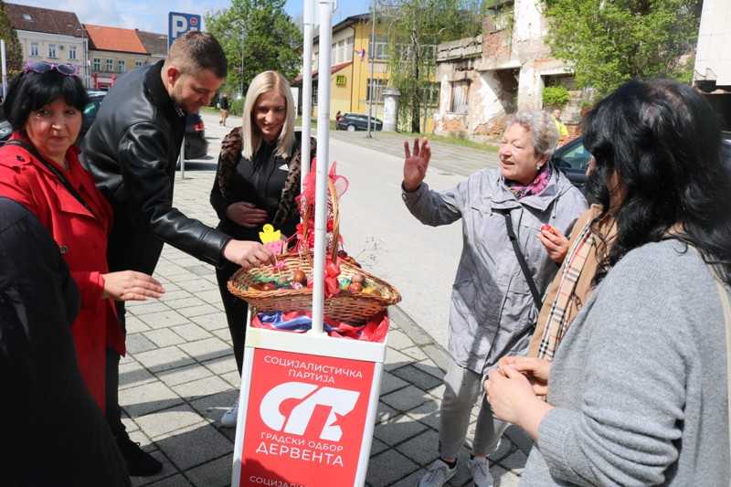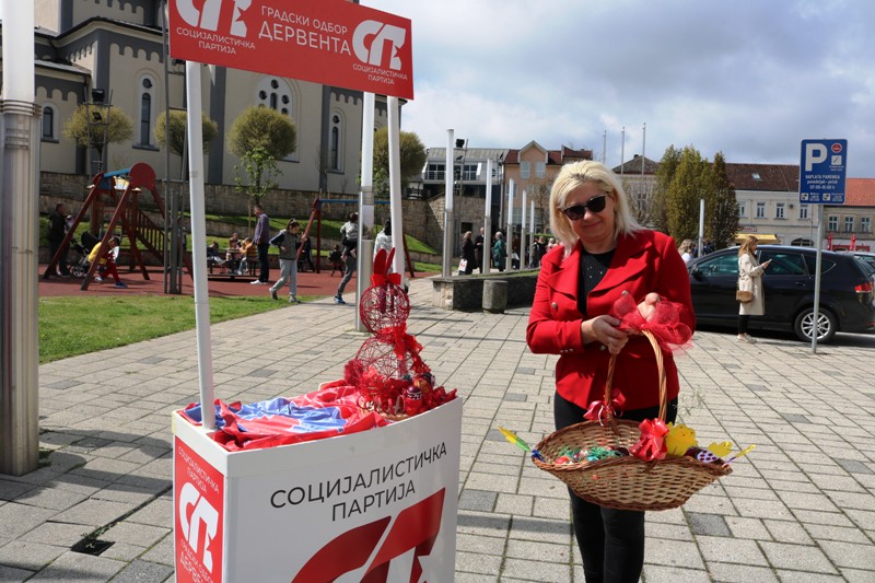 Članice Aktiva žena Gradskog odbora Socijalističke partije /SP/ Derventa danas su na Trgu pravoslavlja građanima dijelile vaskršnja jaja.