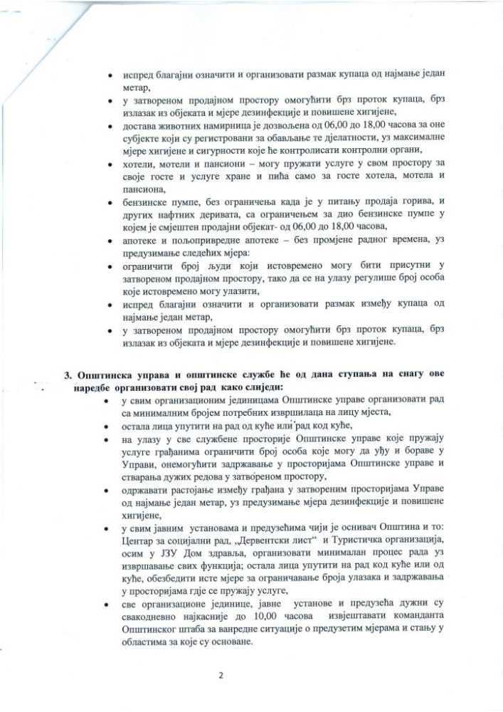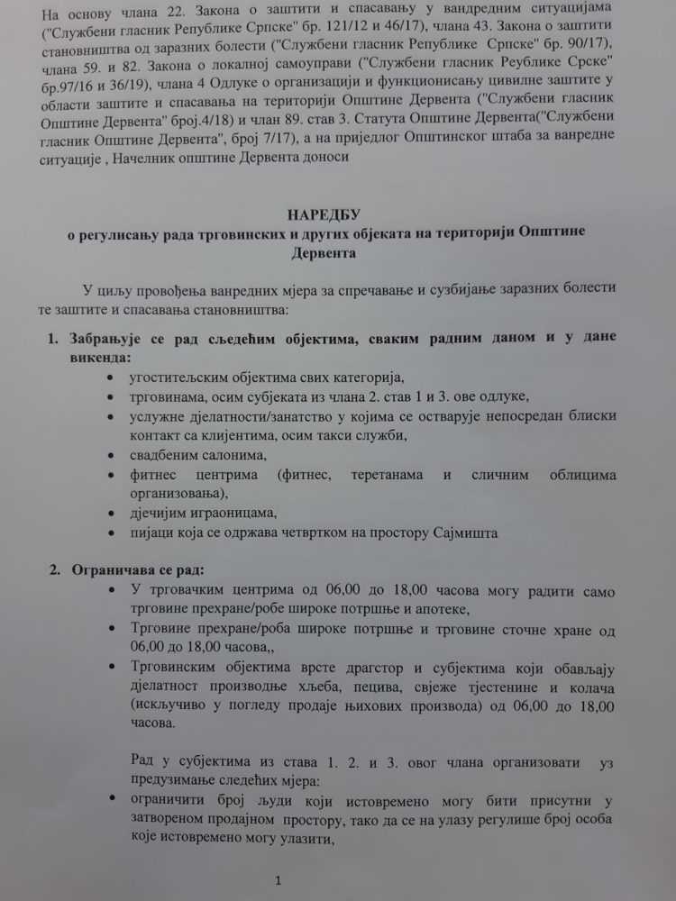 Naredba se odnosi na rad trgovinskih i drugih objekata na području opštine Derventa.