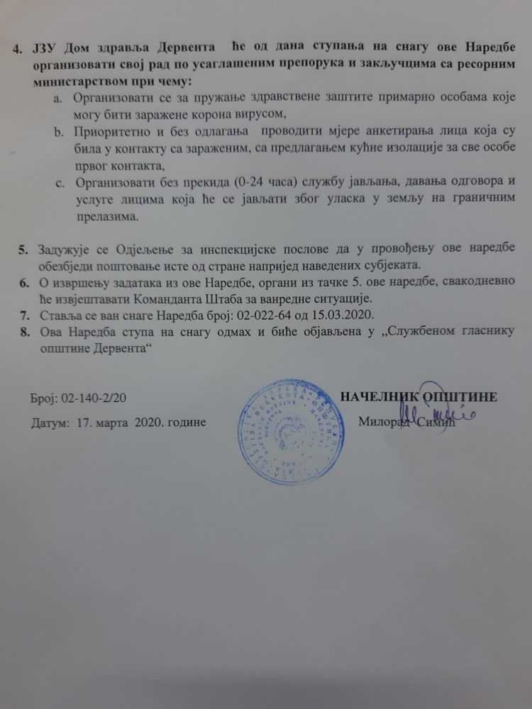 U DERVENTI ZABRANJEN RAD JAVNIM USTANOVAMA