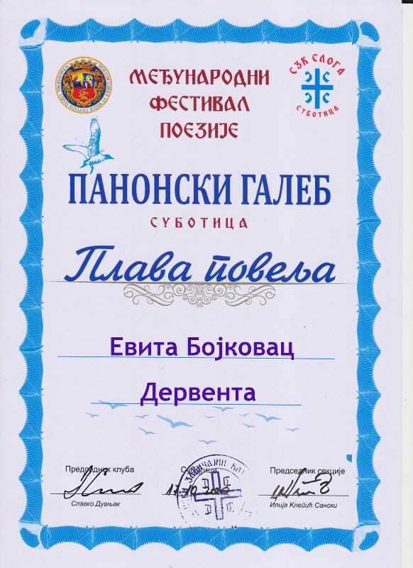 EVITI PLAVA POVELJA SA MEĐUNARODNOG FESTIVALA POEZIJE ,,PANONSKI GALEB” SUBOTICA