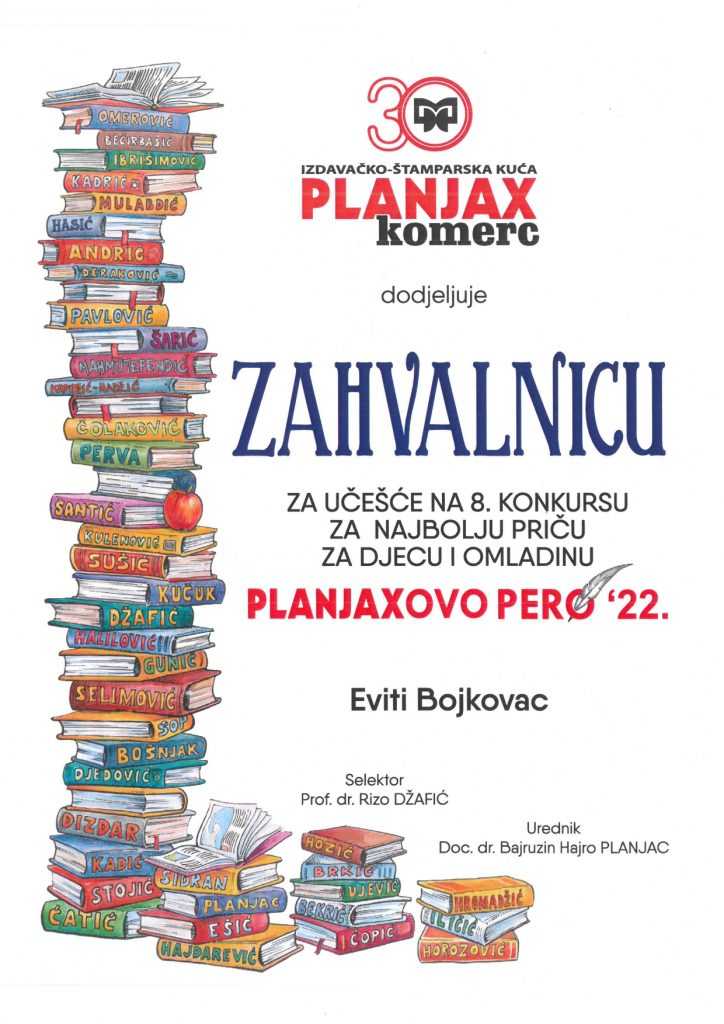 Evitina priča pod nazivom “Leptir i vila” zastupljena je u zborniku radova osmog konkursa Planjaxovo pero.