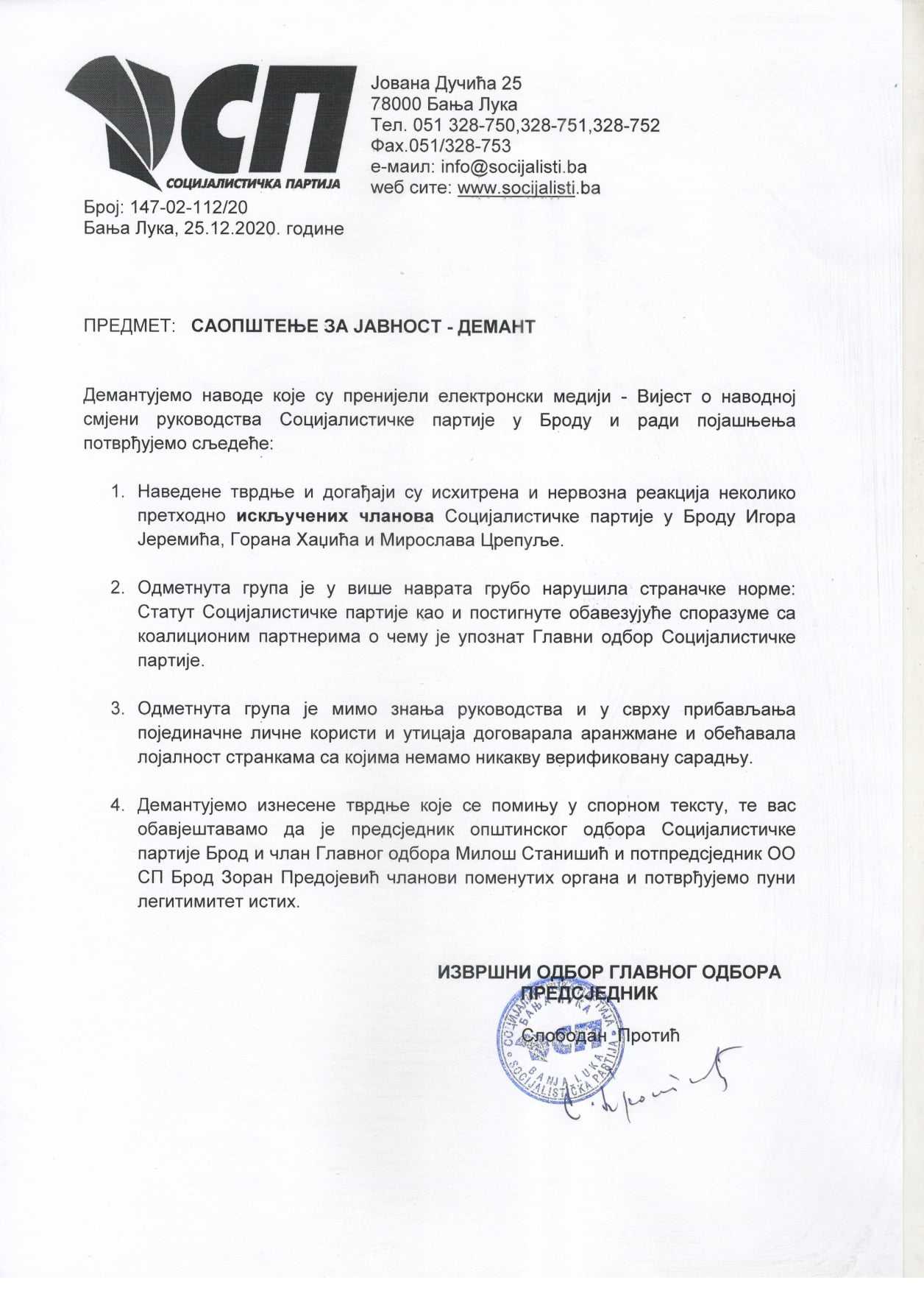 - Demantujemo iznesene tvrdnje koje se pominju u spornom tekstu, te vas obavještavamo da je predsjednik optšinskog odbora Socijalističke partije i član Glavnog odbora Miloš Stanišić i potpredsjednik OO SP Brod Zoran Predojević članovi pomenutih organa i potvrđujemo puni legitimitet istih.“