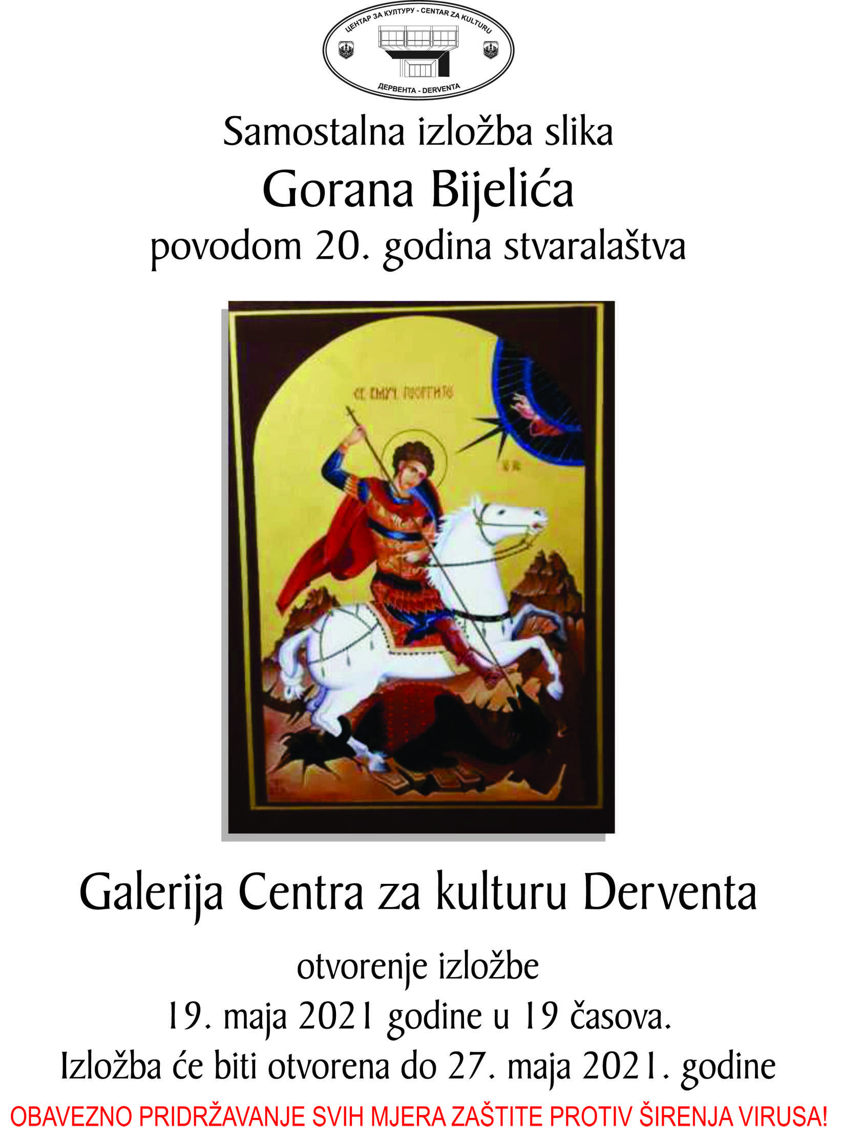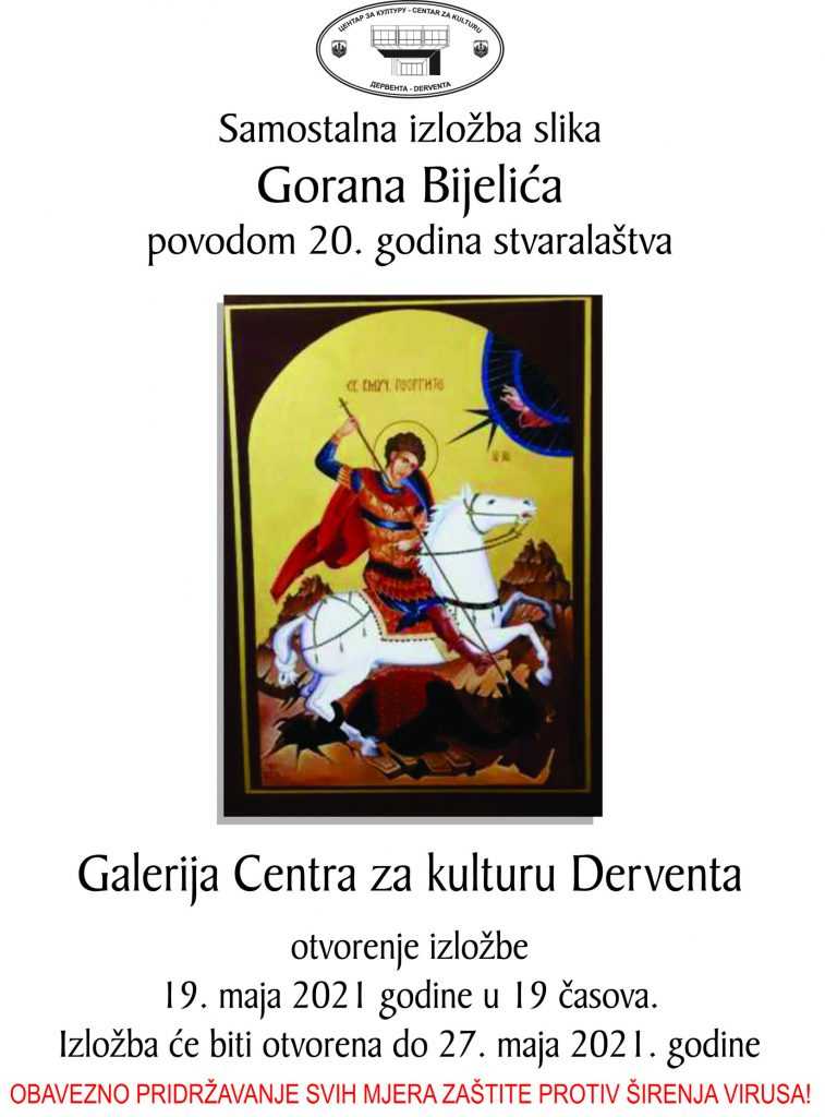 Samostalna izložba slika Goran Bijelića povodom 20. Godina stvaralaštva održaće se u Galeriji Centra za kulturu Derventa, u srijedu 19. Maja u 19. časova.