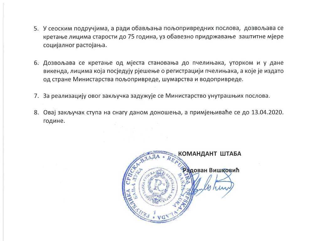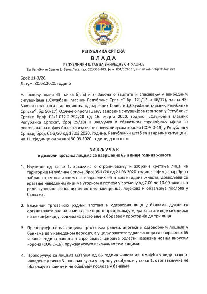 Republički štab za vanredne situacije je donio zaključak o dozvoli kretanja lica sa navršenih 65 i više godina života.